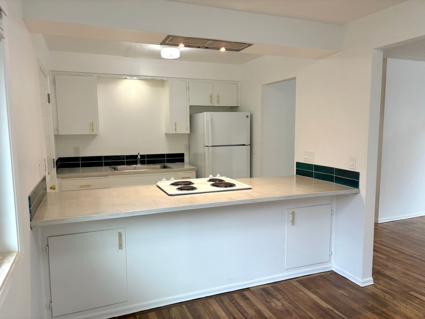 - Galley kitchen with tiled flooring, with new refrigerator and electric range/stove, ceiling-lit sink and lots of cabinet space