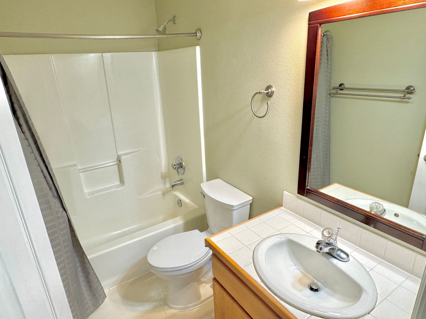 - Full bathroom with linoleum flooring, tiled vanity, full-sized one piece tub/shower surround