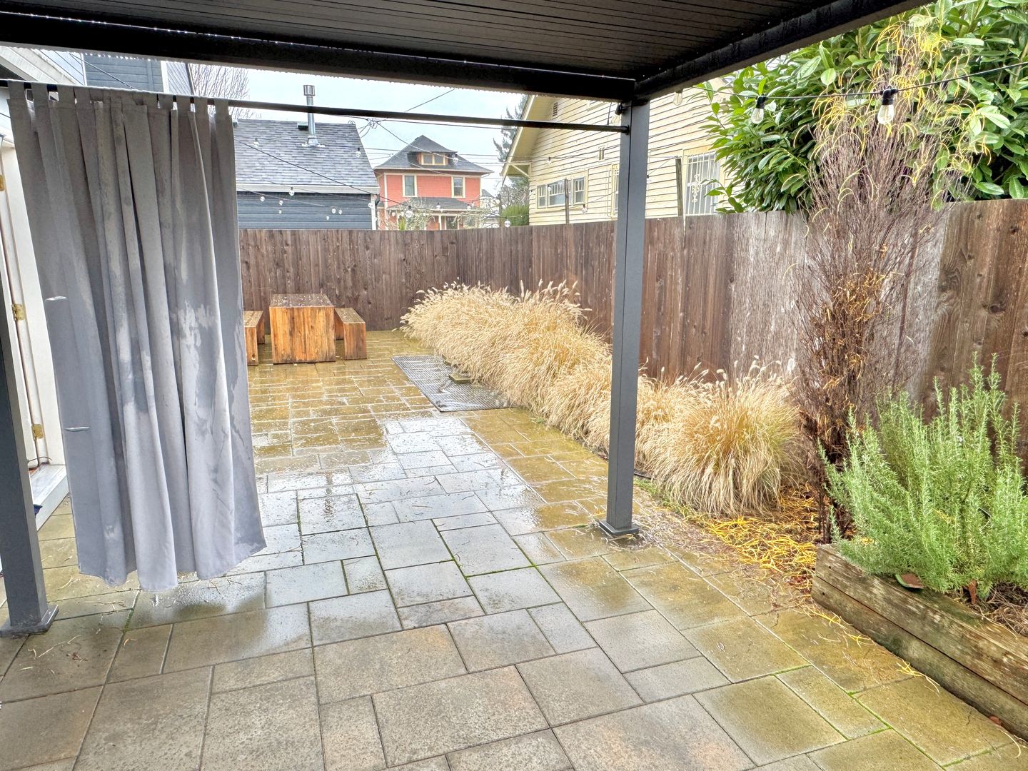 - Fully fenced backyard accessed through kitchen, with beautiful paver patio, large picnic bench, pergola/covered patio, gardening space