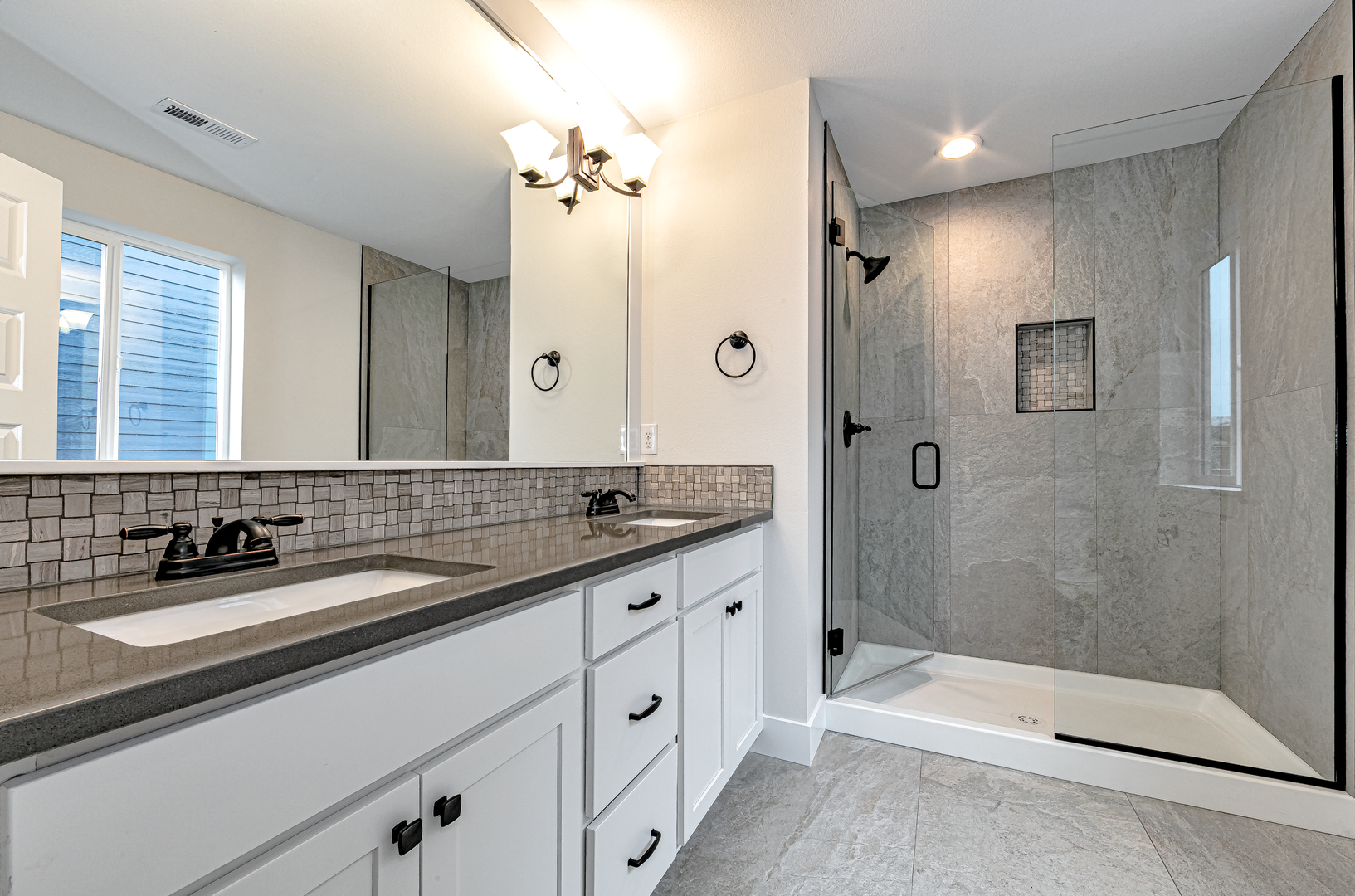 - Bathroom with custom tiled flooring, 2 sinks, glass-door shower with floor to ceiling tiled walls and built-in bottle shelf