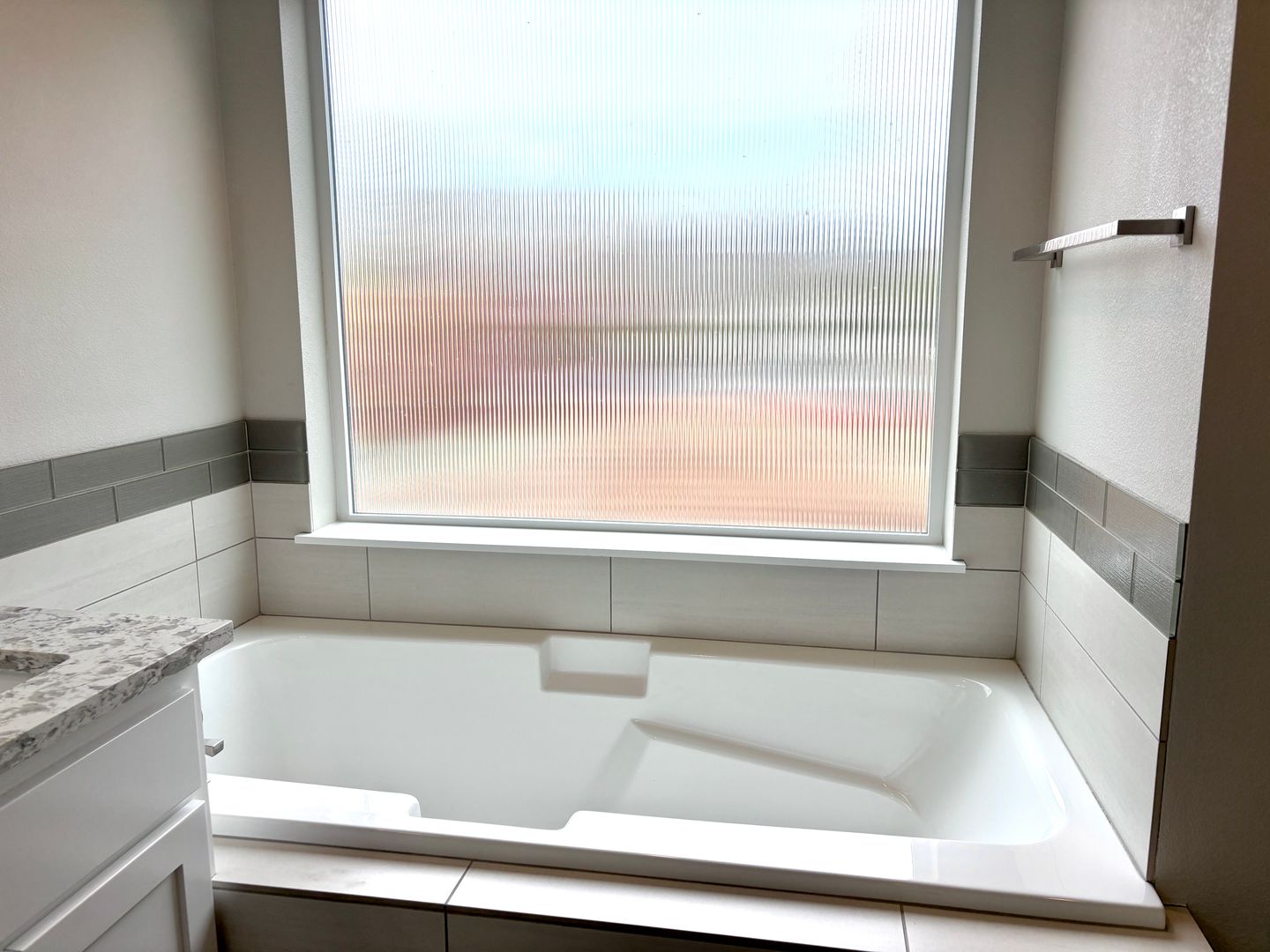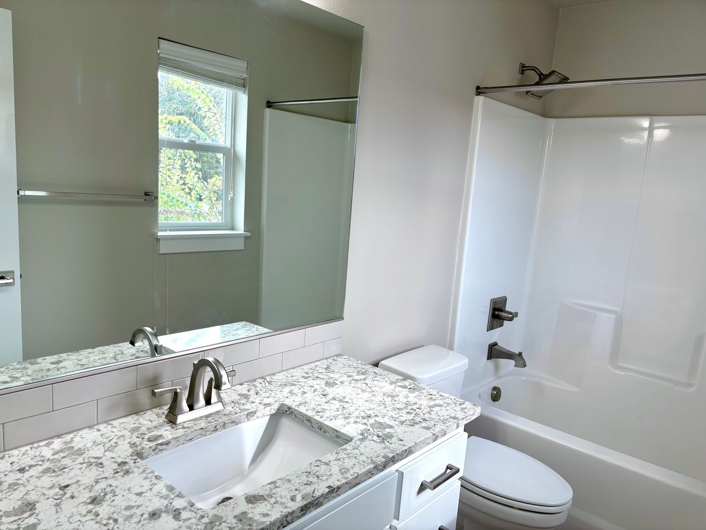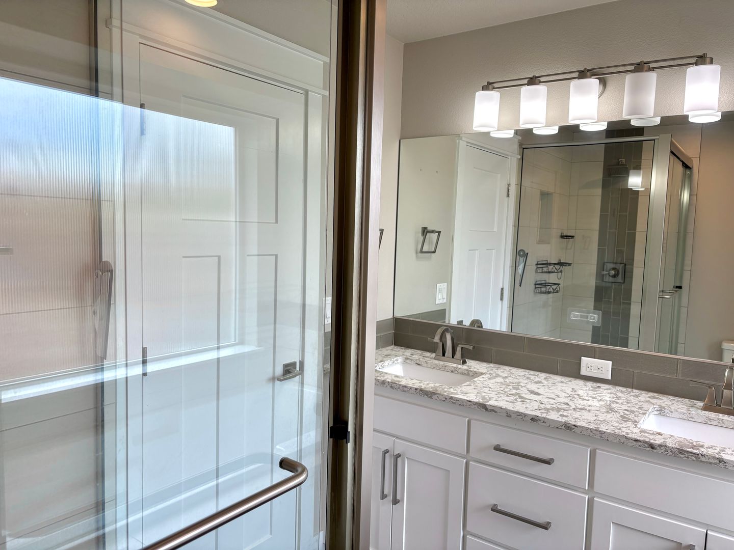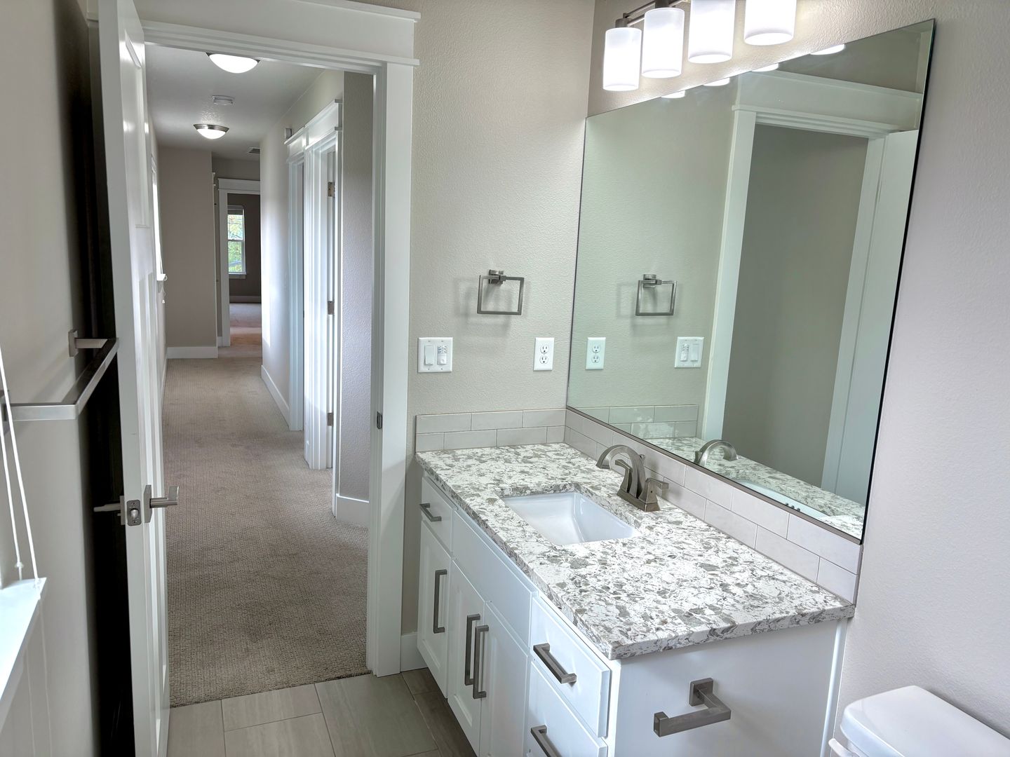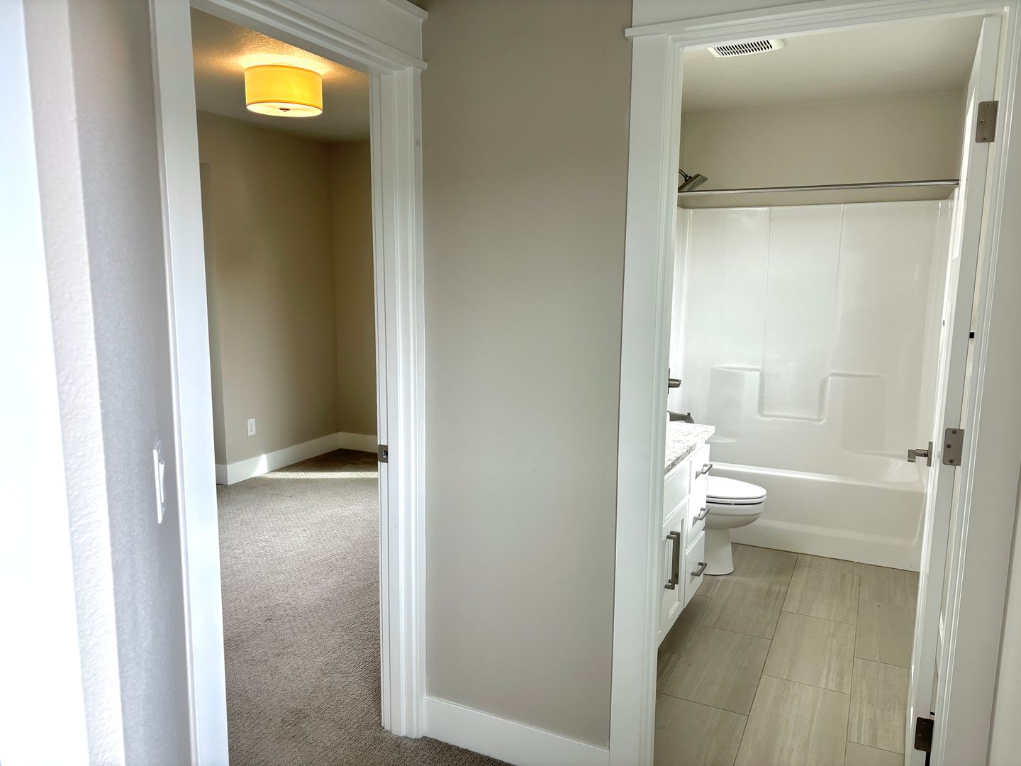 - Next to the bedrooms is a shared full bath with enclosed tub with a vanity