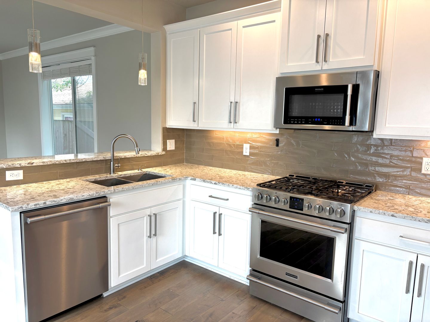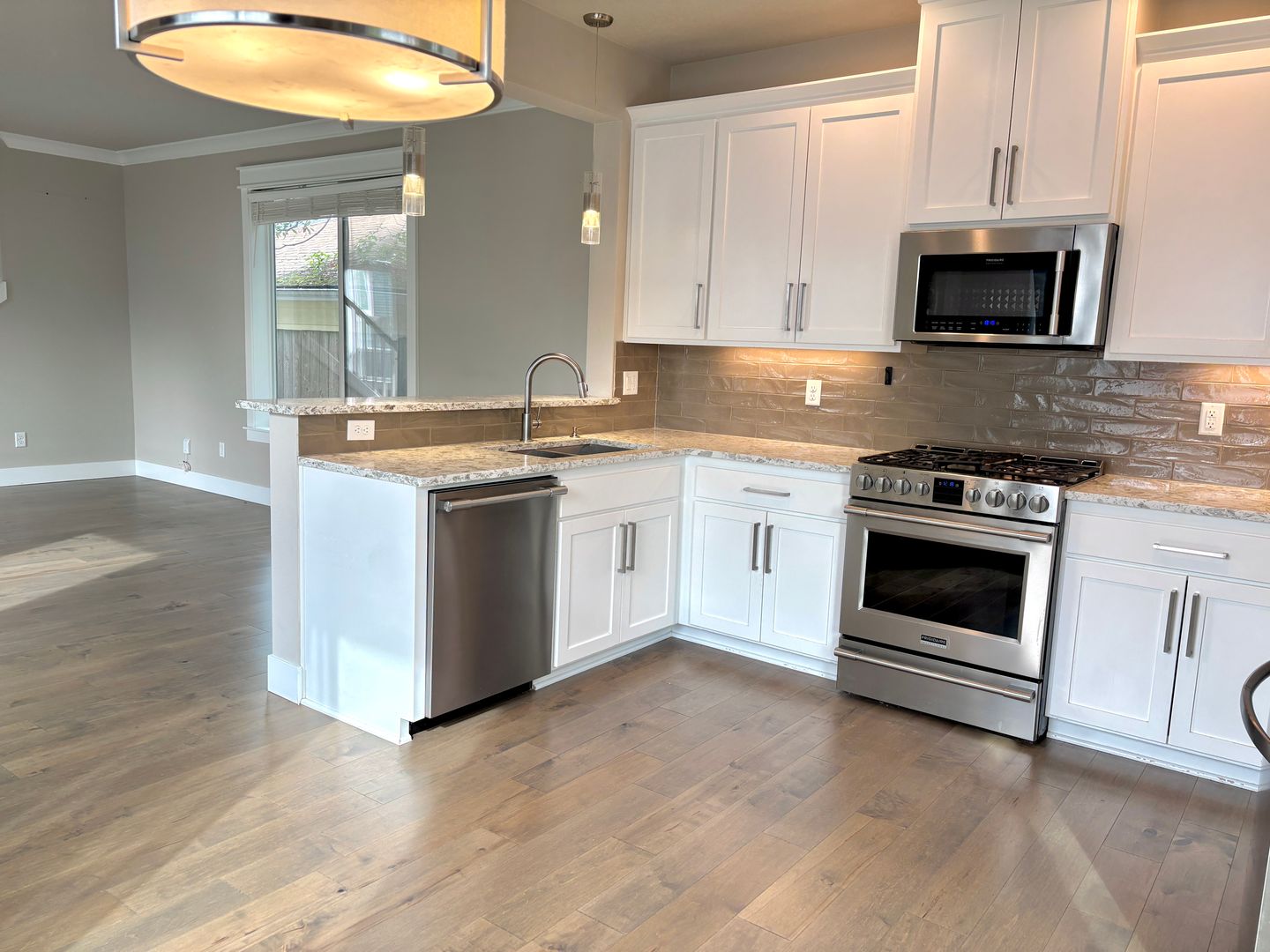 - Full kitchen with quartz countertops, breakfast bar and stainless steel appliances including refrigerator, built in microwave above gas range, dishwasher, and garbage disposal
