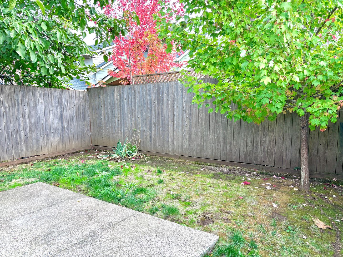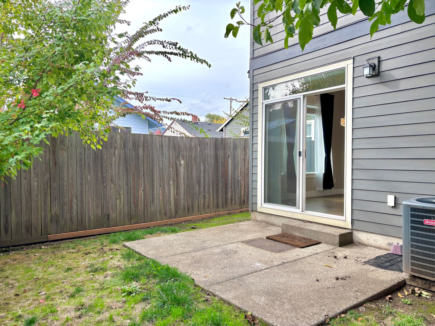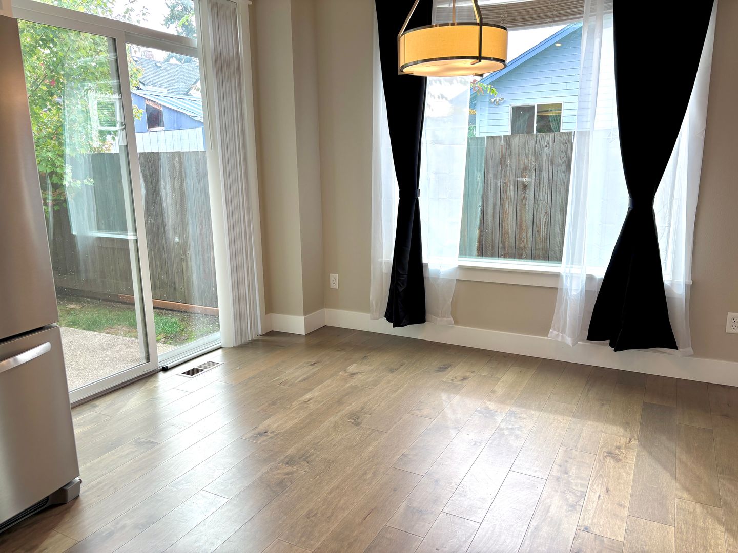 - Dining area next to kitchen with sliding door to concrete patio in the fenced back yard